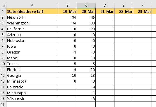 9 more deaths yesterday in Washington State. I’ve started to keep track of the states where I have family/peeps. I’m not sure if this is a good idea or not but having a spreadsheet makes me feel a bit more in control. I have spreadsheets for everything.